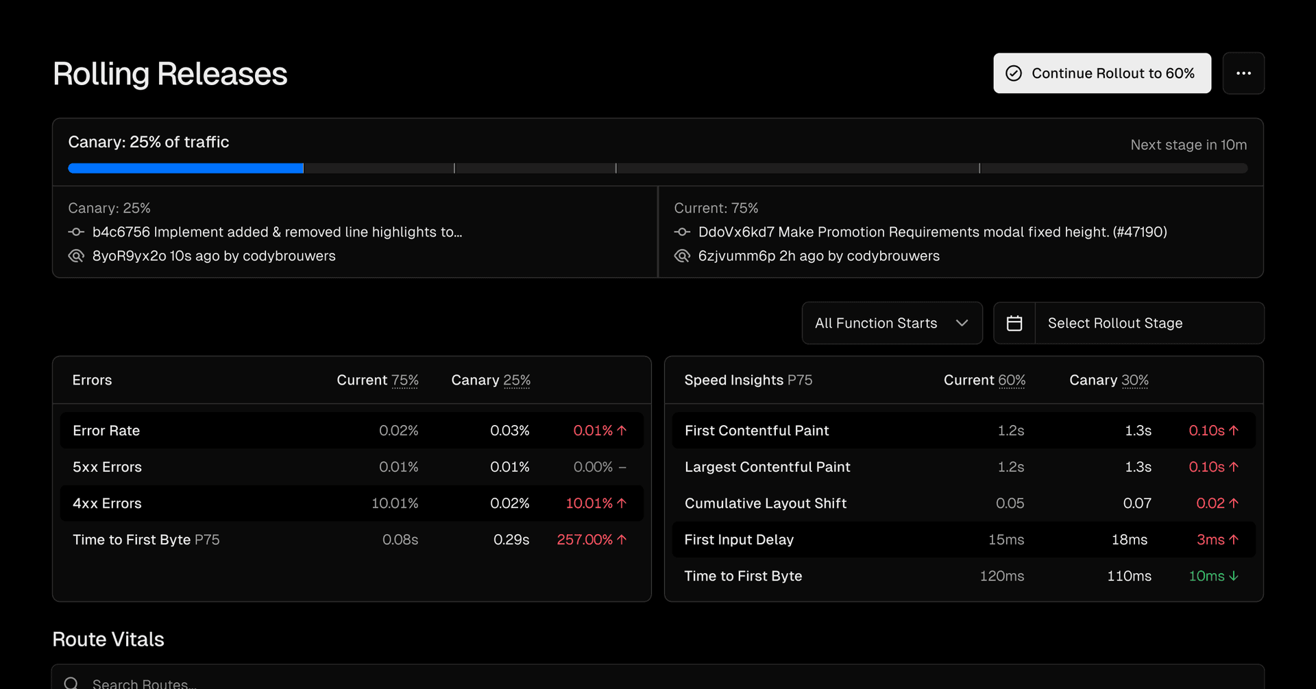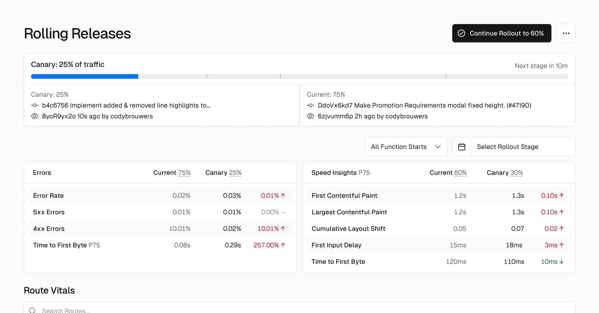 Rolling Releases allow safe, incremental rollouts of new deployments to a subset of users with built-in monitoring, rollout controls, and no custom routing required. If metrics like Time to First Byte (TTFB) degrade or errors spike, the rollout can be paused or aborted entirely.