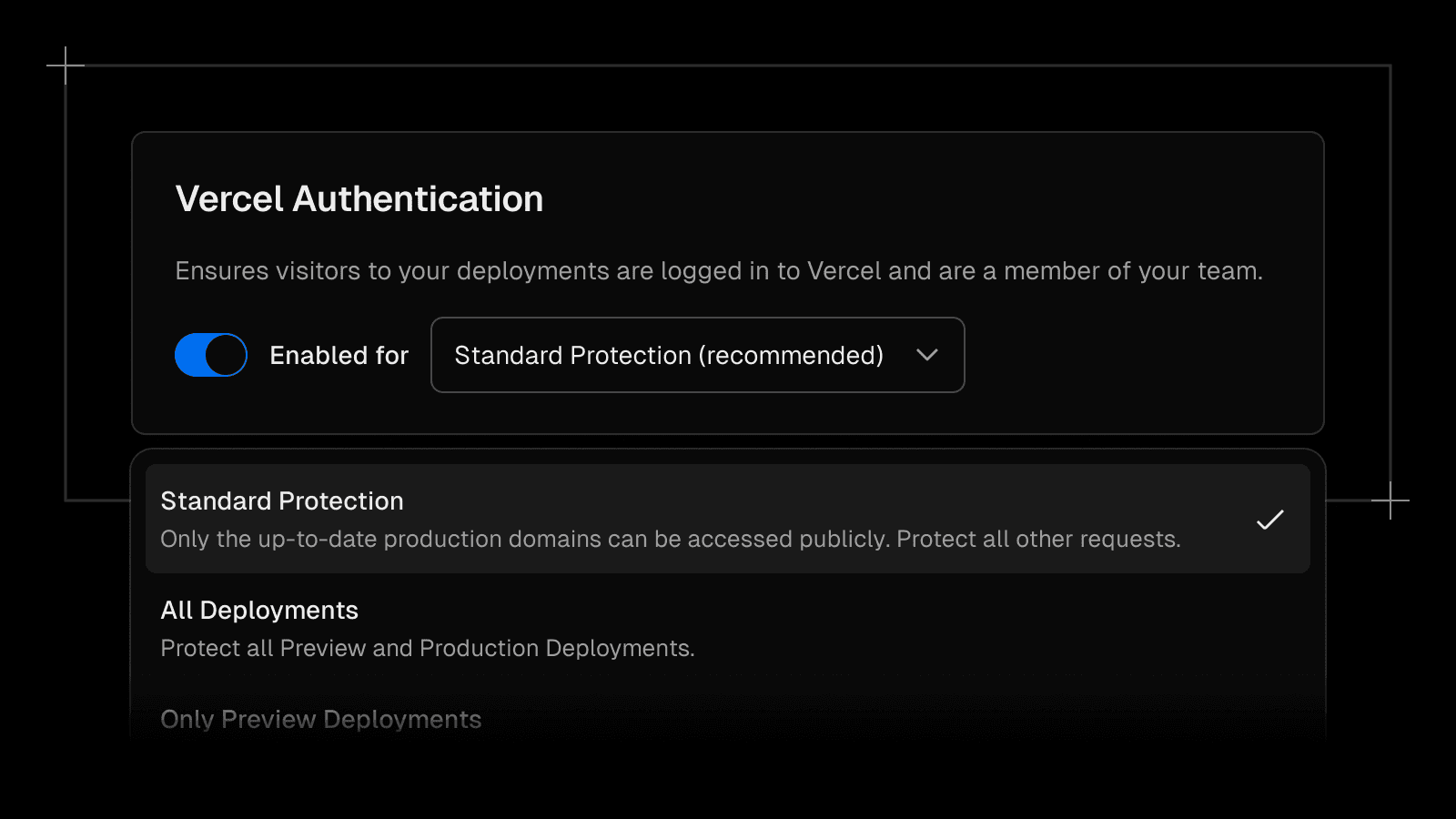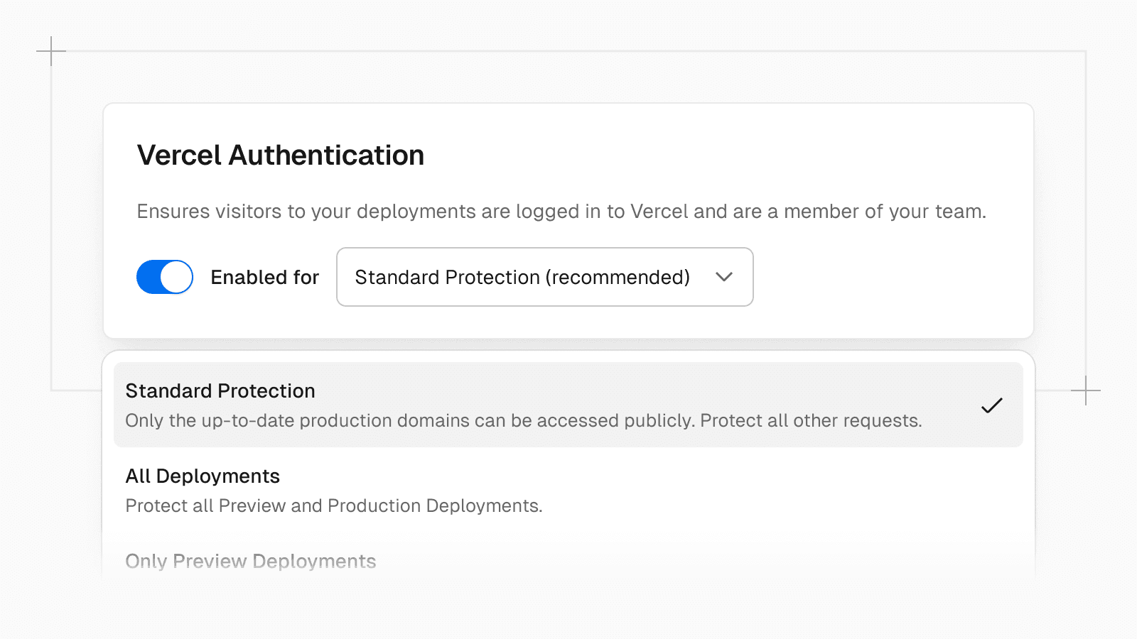 To configure existing deployments with Deployment Protection, you can use this migration guide. For all new deployments, Deployment Protection with Vercel Authentication is now enabled by default.