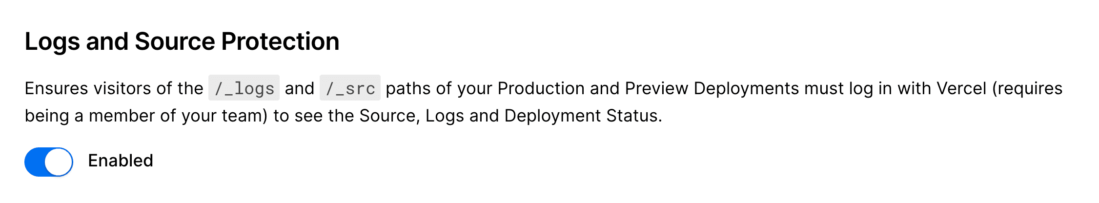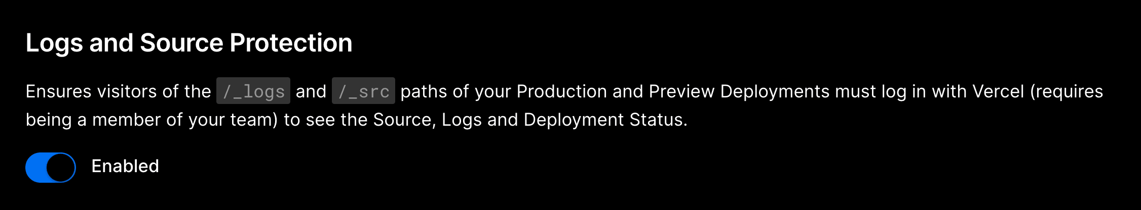 The pathnames and redirect to and require logging into your Vercel account to access any sensitive information. By default, a third-party can never access your source or logs by crafting a deployment URL with one of these paths.