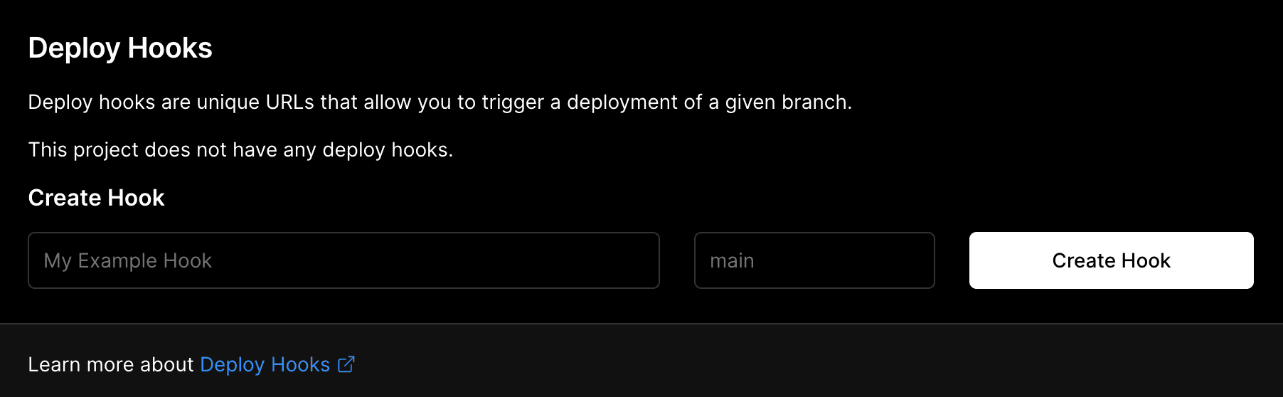 In the "Deploy Hooks" section, choose a name for your Deploy Hook and select the branch that will be deployed when the generated URL is requested.