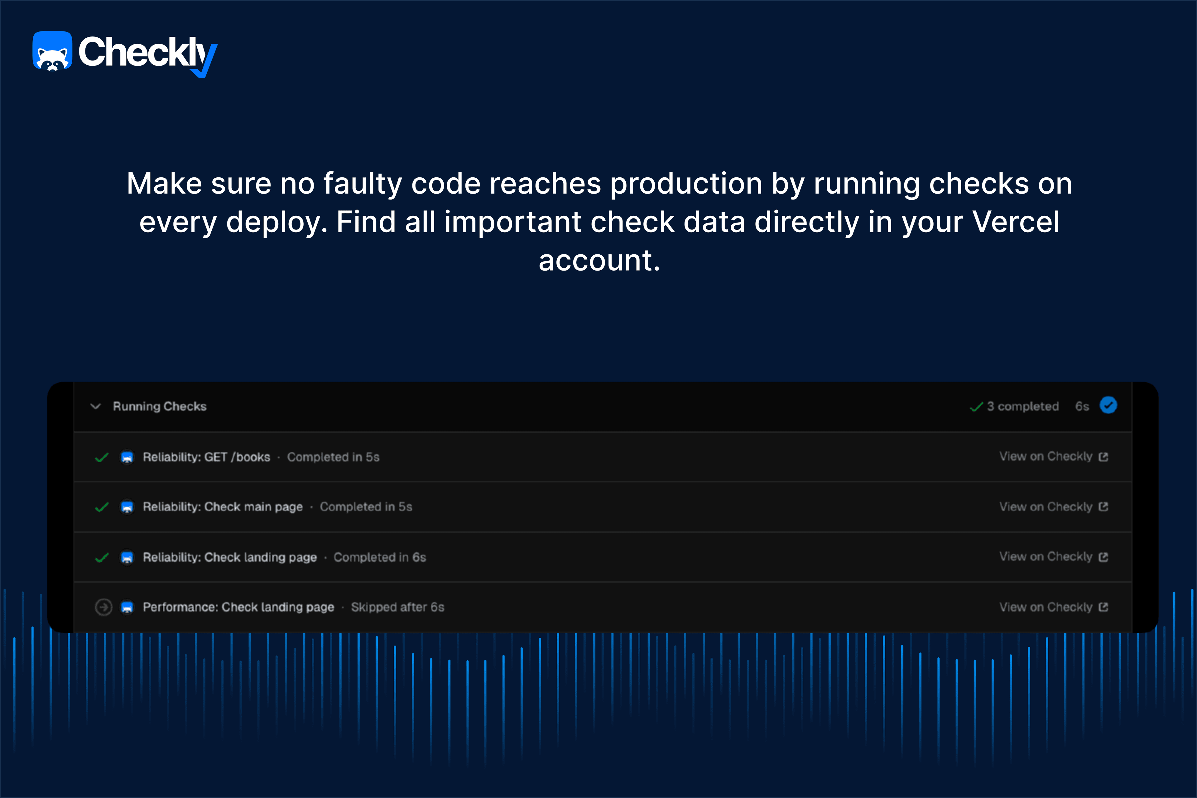 Playwright Testing & Monitoring: Trigger end-to-end Playwright tests and API monitoring whenever you deploy to your Vercel app, ensuring your apps remain fast, reliable, and error-free.
